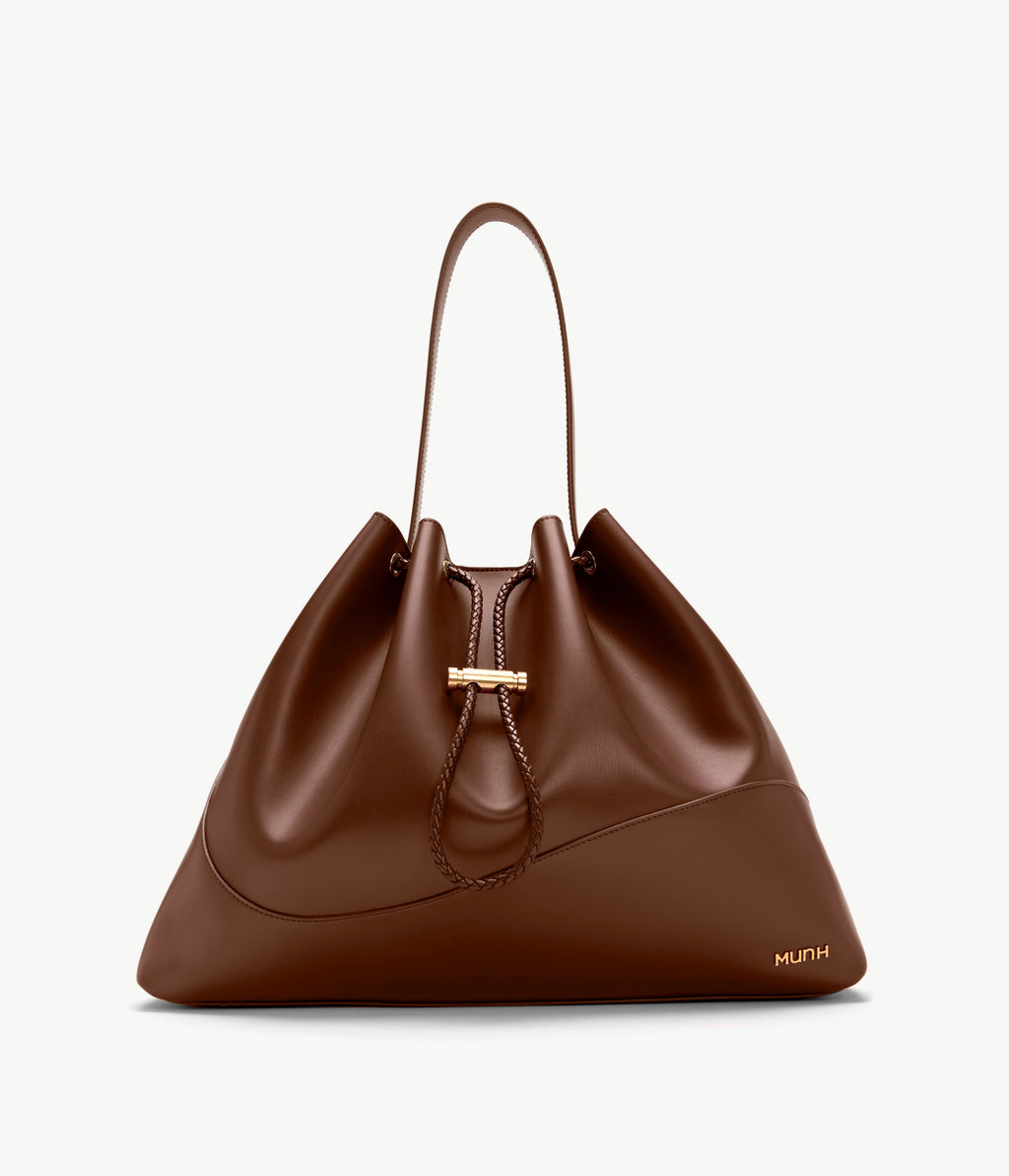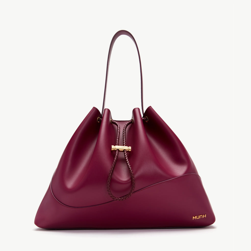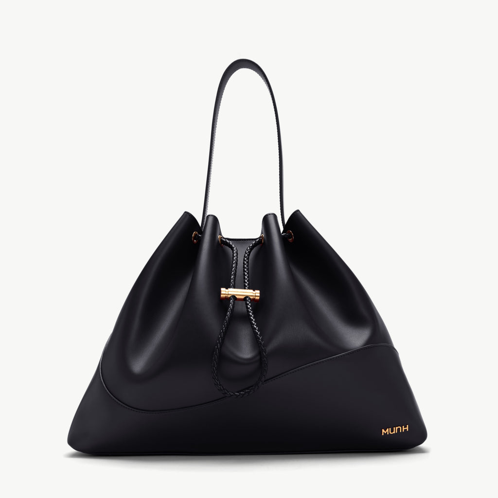Munh interprets the modern drawstring handbag style with an elongated base to create an angular silhouette, complementing the overall softness of the style. The Aalto shoulder bag features a signature wave base and engraved toggle closure. Each Munh bag is finished with a hand-placed bezel-set rose quartz signifying self love.