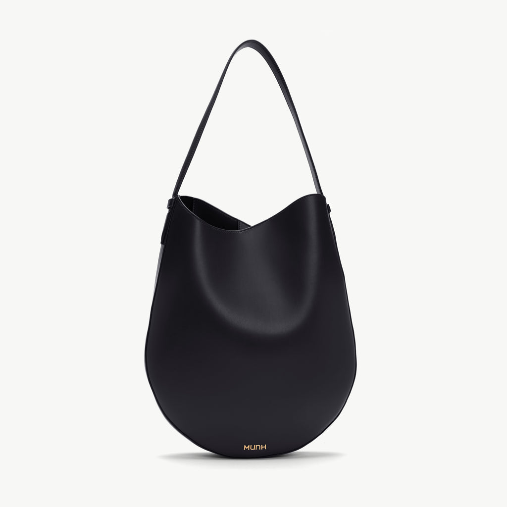 Modern and sculptural, structural yet fluid, the Laine Hobo bag features clean lines and a sleek, understated silhouette. Designed to be worn over the shoulder. Each Munh bag is finished with a hand-placed bezel-set rose quartz signifying self love.